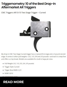 My drop-in CMC Two Stage Curved trigger has a 2-pound first stage and a 3-pound second stage. It comes in other pull weights—2/2, 1/3, 2/4 and 2/5 pounds—and each is creep-free and offers a crisp break. Models are available for small or large pin sizes. https://www.athlonoutdoors.com/article/ar-triggers/